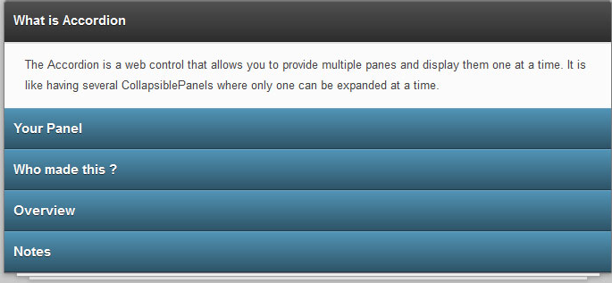 <li><input type=\”radio\” id=\”ac-1\” name=\”ac-3D\” checked=\”checked\”/><label for=\”ac-1\” onclick=\”\” title=\”What is Accordion\”>What is Accordion</label><article><p>The Accordion is a web control that allows you to provide multiple panes and display them one at a time. It is like having several CollapsiblePanels where only one can be expanded at a time.</p></article></li>